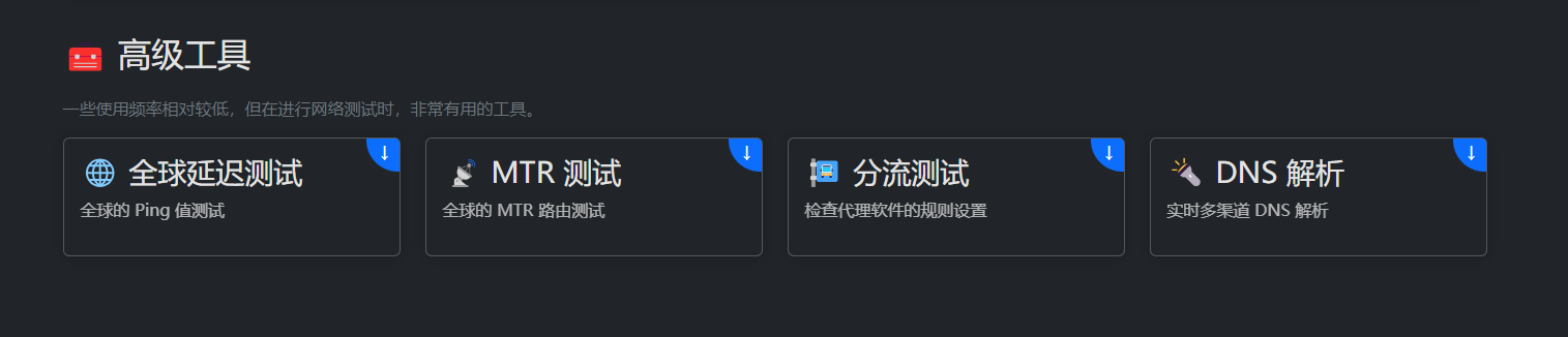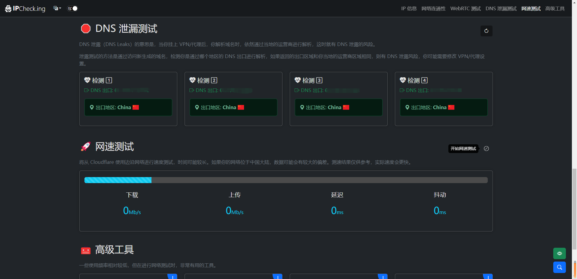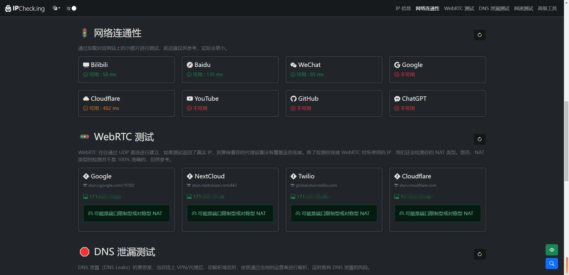 通过这个工具,可以查看需要查询的公网IP地址、连通性、检查 WebRTC 连接、检查 DNS 、网速测试、MTR测试等。